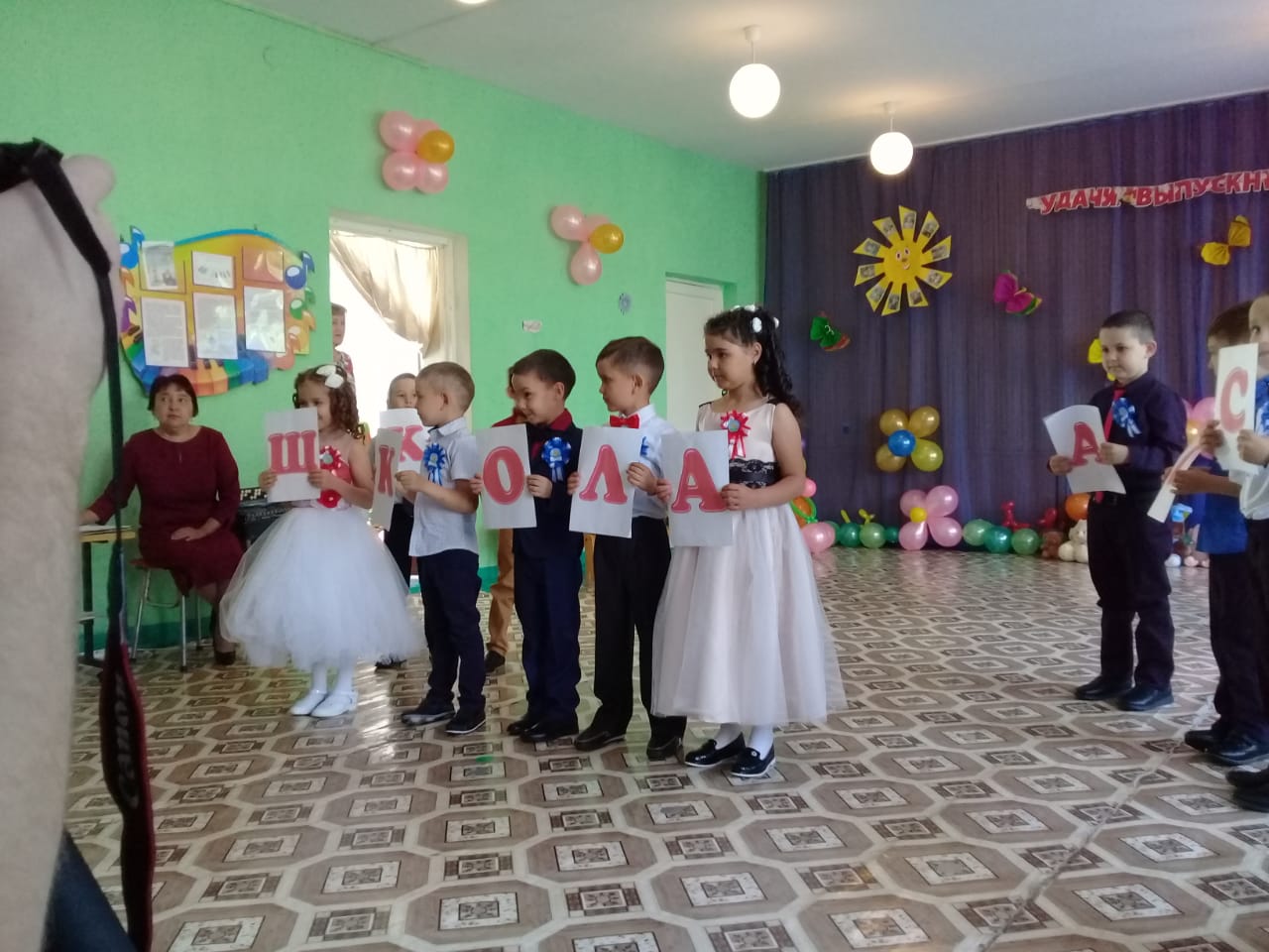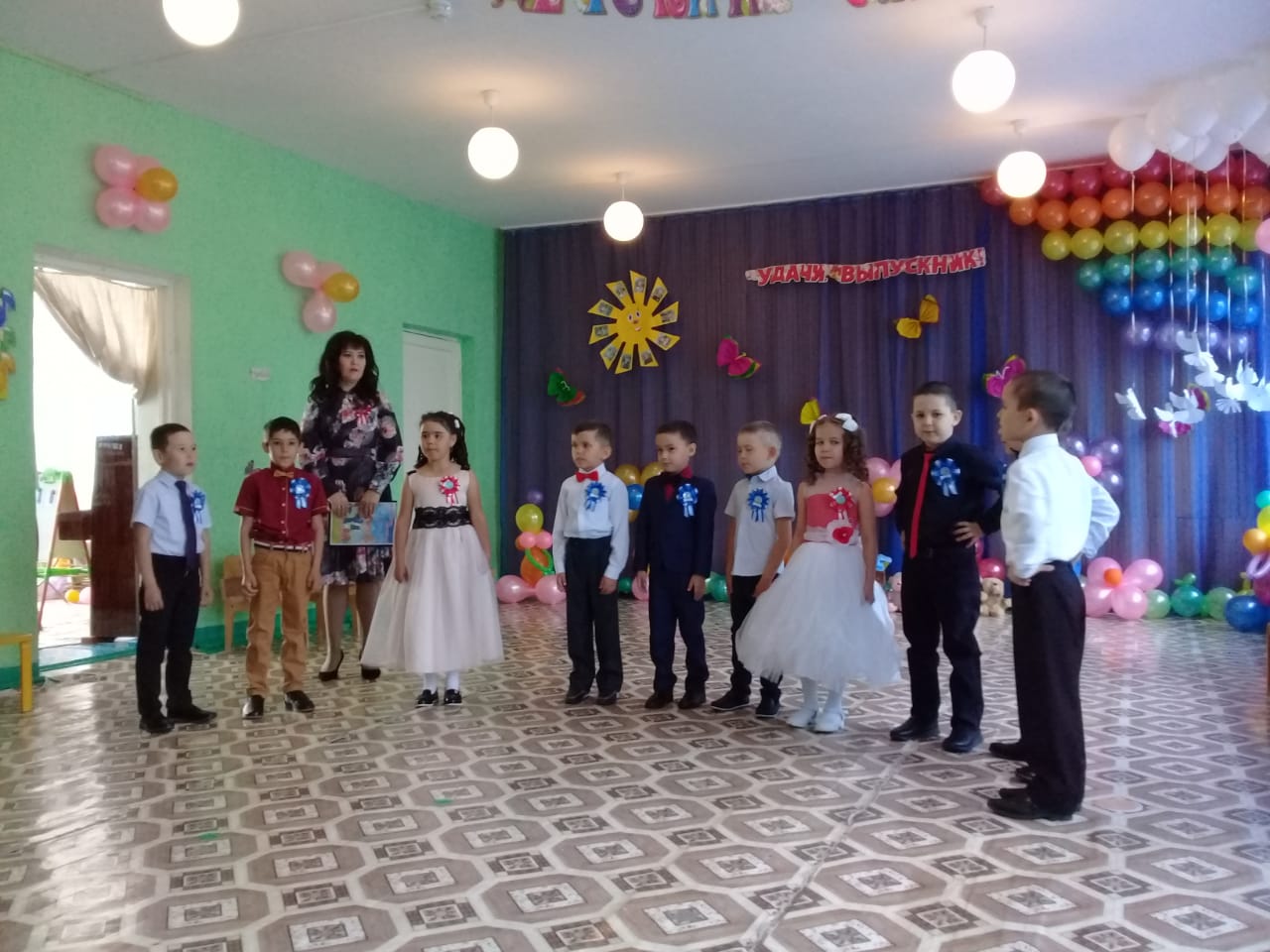 30 мая в старшей группе "Солнышко" в детском саду царила необыкновенная атмосфера. Девочки в воздушных платьицах, мальчики в строгих костюмчиках собрались в музыкальном зале. Родители то и дело поправляли пышные наряды своим чадам и беспрерывно щелкали фотоаппаратами. И те, и другие заметно волновались: ведь это было очень важное для ребят событие – первый в жизни выпускной бал. С этим праздником детей поздравляли все сотрудники детского сада, родители, и приглашенные на праздник гости. На празднике также присутствовали гости: умный Буратино, активистка Баба яга и очаровательная Шапокляк. Все вместе они проводили выпускников в школу! Кульминацией же всего праздника стало вручение дошкольникам дипломов об окончании детского сада.